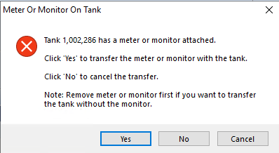 Company owned tanks will receive this message if CT (Customer Transfer action) or PU (Pick Up) is selected under Change Inv Status. Selecting Yes to transfer an attached monitor once the pickup or transfer of the tank is complete displays the Change Inventory Status box for the monitor or meter. When No is selected the Change Tank Inventory Status box will close.