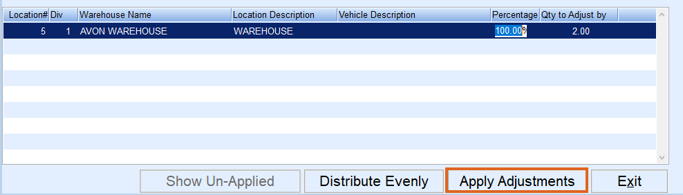 Note: If the Qty to Adjust by is to be distributed to all Storage Locations, select Distribute Evenly at the bottom the screen and the system will automatically input all storage locations and the Qty to Adjust by will automatically update. - Enter the quantity the storage location is to receive. The % field will automatically update.