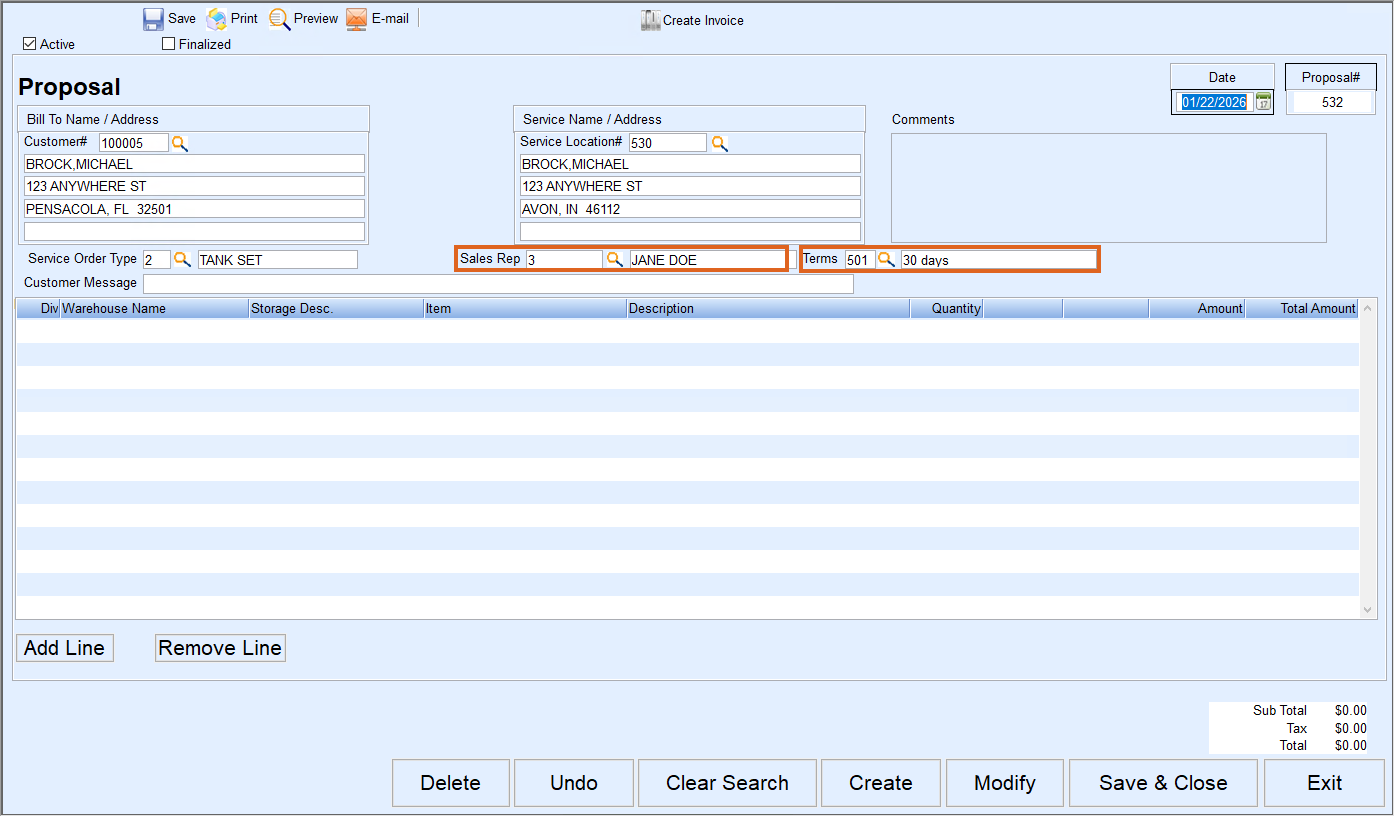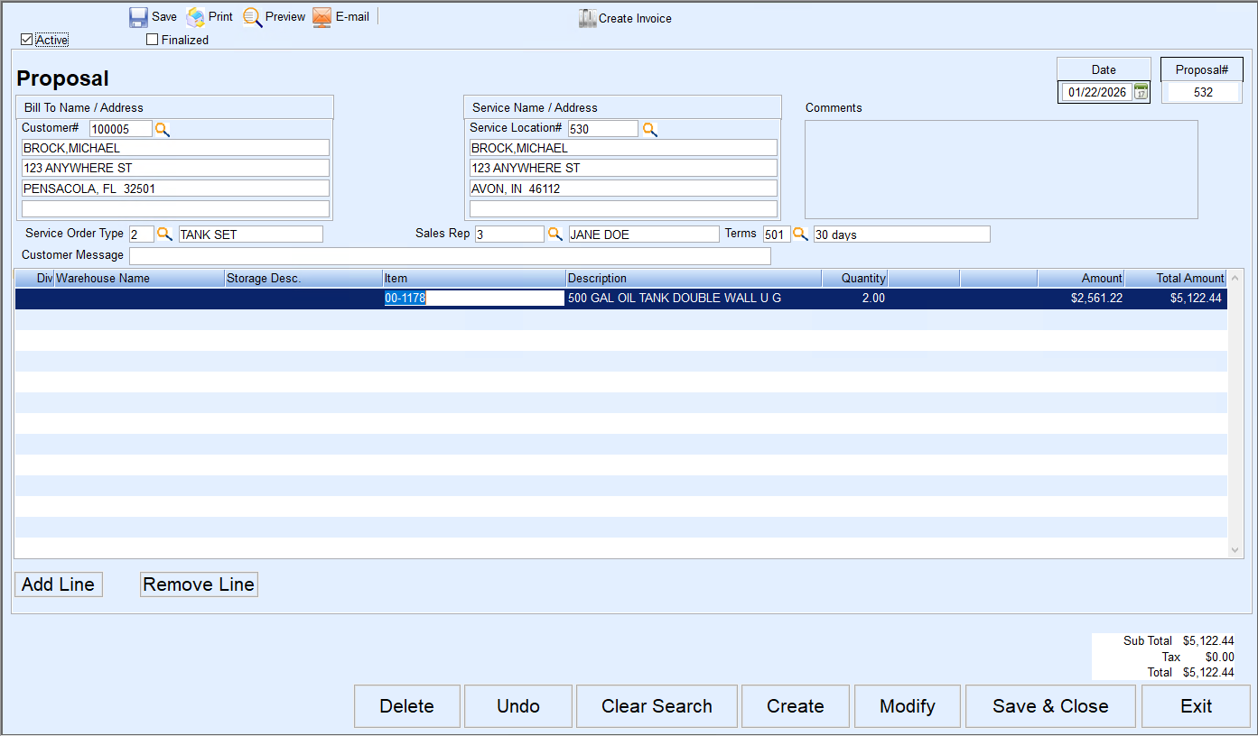 Creating a Proposal from a Service Order gives the ability to enter items that will be used to complete the Service Order and provide the customer with a cost estimate.
