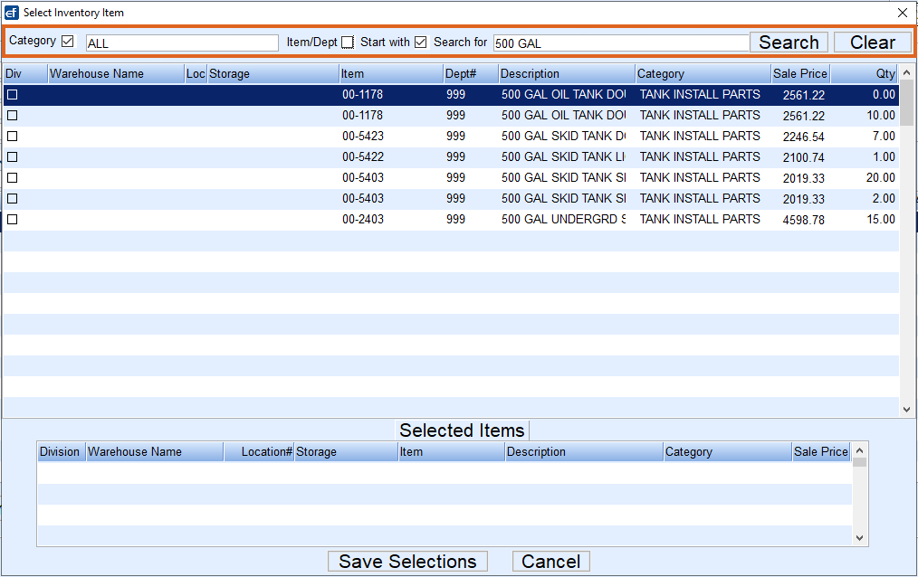 - The Select Inventory Item screen displays all items that have been set up in the maintenance tables and will default to the Warehouse Location the Service Location is assigned.