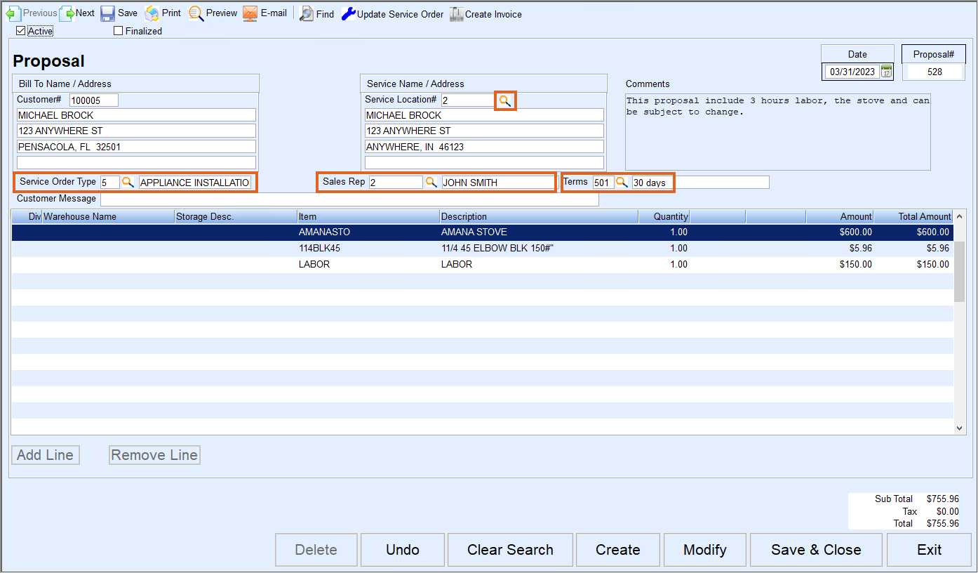 - Select the Service Location by pressing F5 or selecting the Search icon. Input the Service Order Type, Sales Rep, and Terms Code. Enter any applicable Customer Comments that will appear on the Proposal when printed.