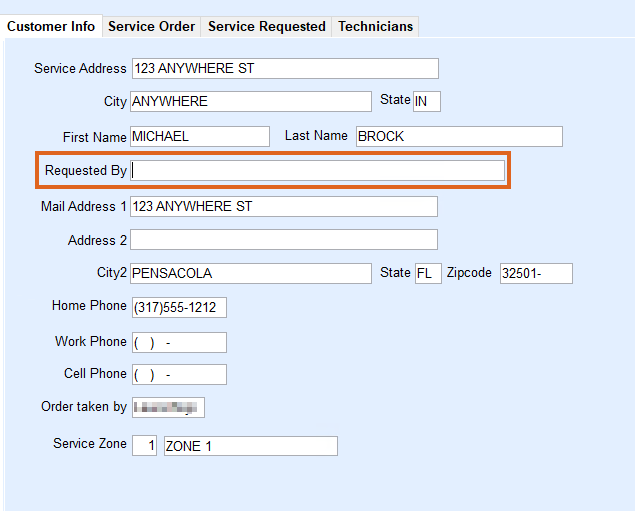 - In the Requested By field located on the Customer Info tab, enter who requested the Service Order. The Service Address and other information can be modified as necessary.