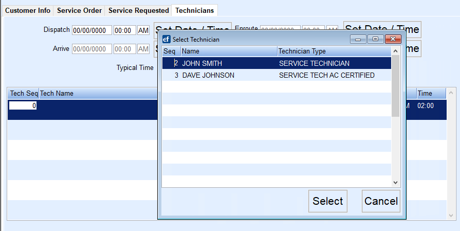 - In the Technician Seq field, press F5 and select the Technician to assign to the job. If more than one Technician is assigned to the job, arrow down and press F5 to select again.