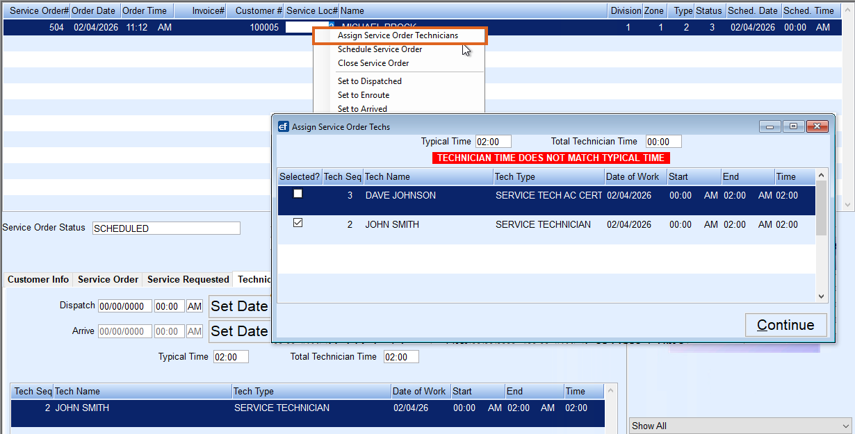 - To assign multiple technicians by a group, right-click on the Location Number at the top of the screen and select Assign Service Order Technician. Checkmark all who apply and select Continue.