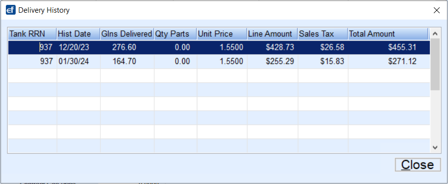 Show Deliveries includes information like the delivery date and number of gallons delivered: