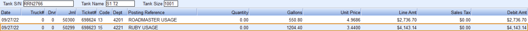 If there is an entry in the Cust Owned Gallons, the information will display: