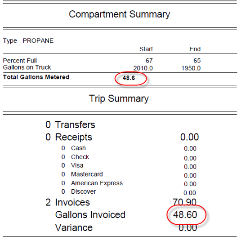 From the Trip report, make sure Metered Gallons equals Invoiced Gallons.