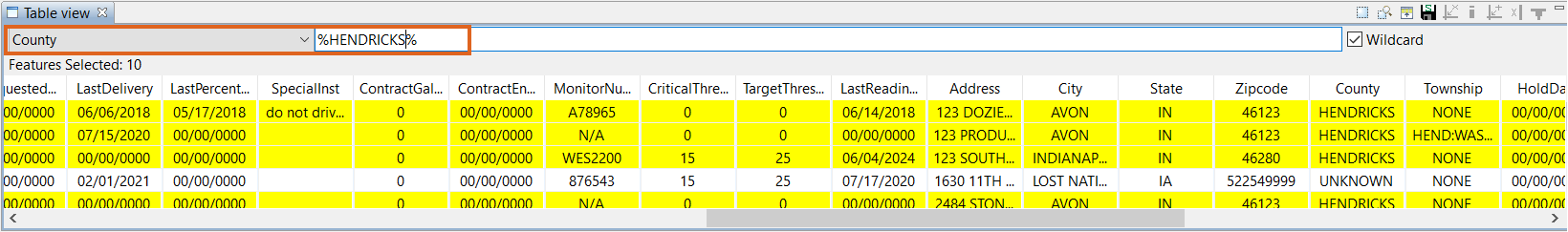 - If performing a general search for street name or city, enter % (wildcard) before and after the word. This will find all items within that string.