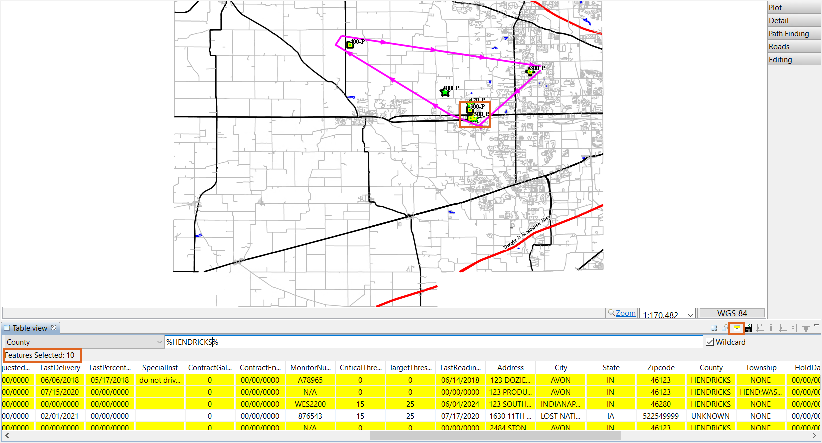 If the system finds a match, it will display a yellow highlight in the table. It will also highlight the items on the map. Features Selected will display the number of items found. If multiple items exist, select the Promote to top of List icon.