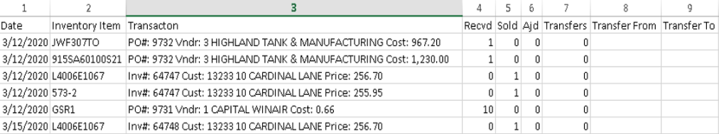 The Detail report displays the detail for each inventory item listed. For example, if the Transaction Type is Sold, the report will display the inventory item, invoice number, and customer number associated with the transaction.