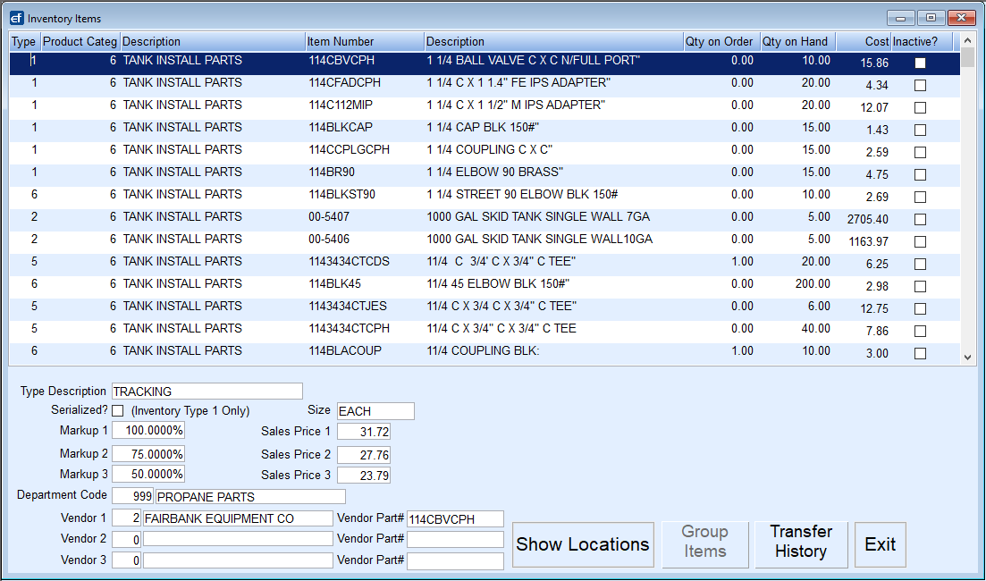 All inventory items used in Service are entered and tracked in this module. Markup pricing, Sales pricing, vendors, Locations, etc. are updated in this file as well.
