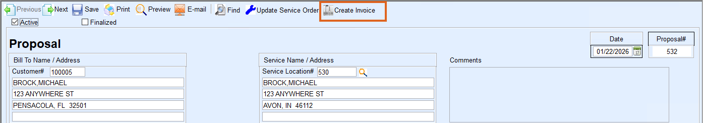 Once a Proposal has been created and the work has been completed, the customer can be invoiced directly from the Proposal.