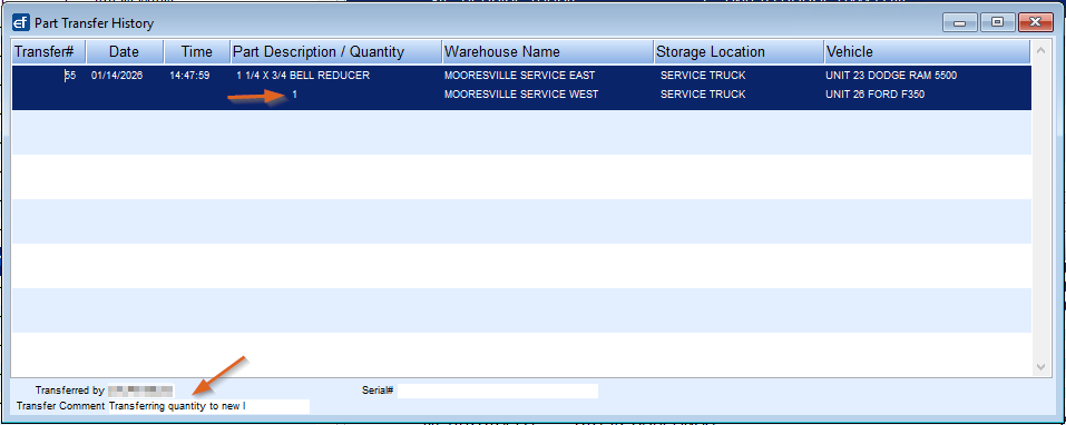 - Choose the Storage Location and Storage Location Part (Non-Serialized Item) to be transferred.