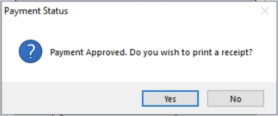 Selecting No will return to the Payment Transaction window. Selecting Yes allows for printing the receipt for the customer and automatically closes the Payment Transaction window.