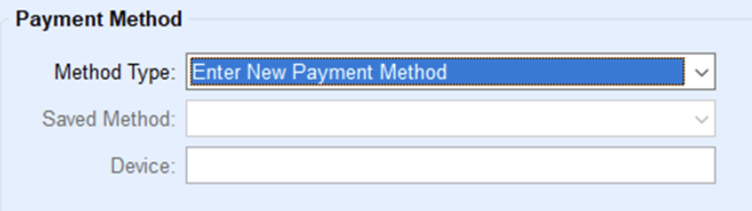- Choose the Method Type in the Payment Method area. If the customer has a saved payment method, Use Saved Payment Method displays in the Method Type field. Additional options include Enter a New Payment Method or Use Payment Device by selecting the drop-down arrow.