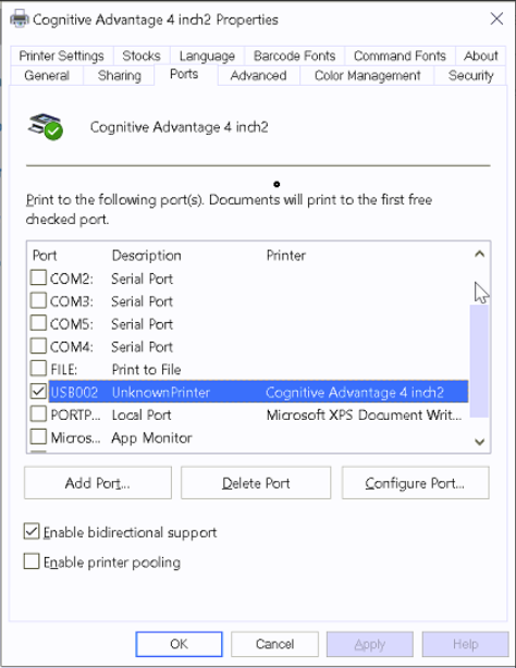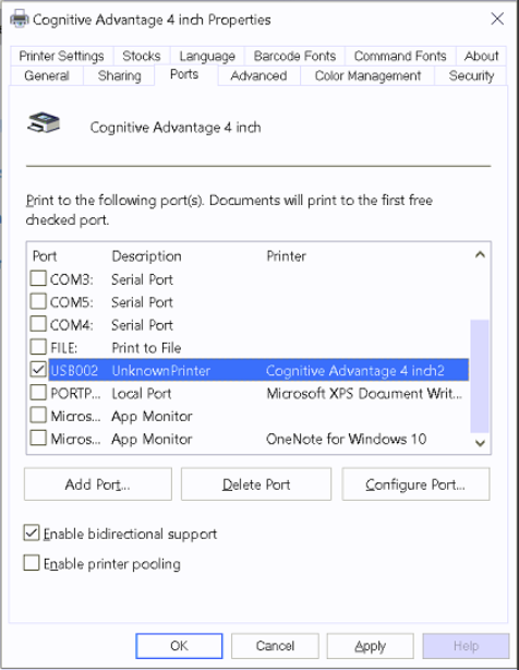 - If it will not print, have your IT department go into the Windows printer settings, specifically Cognitive Advantage 4 inch and Cognitive Advantage 4 inch2 and change the port settings to USB002.