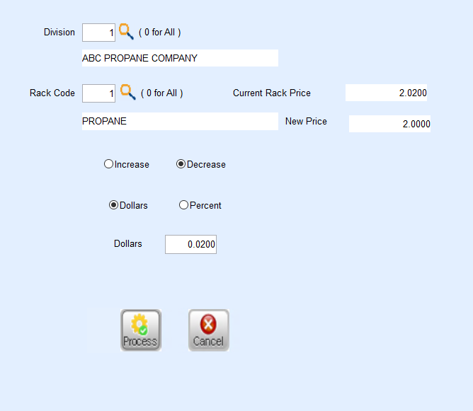 - Select Process. This will update all prices associated with the Rack Code automatically.