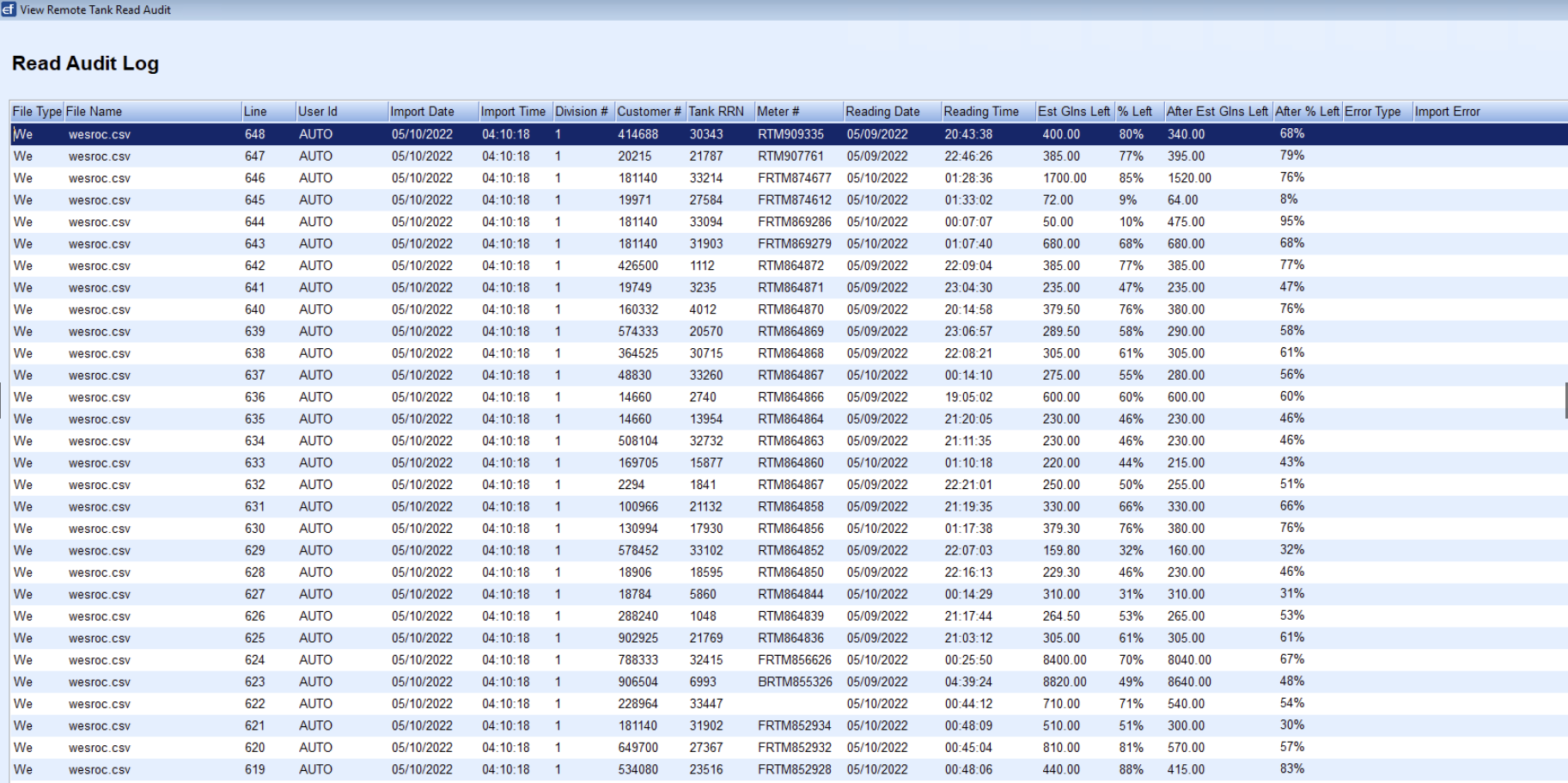 Located in the RTM Import Menu screen, this file displays an audit log of all of the import readings that have been imported. This table can be reviewed to determine if a customer tank has imported properly and displays the tank imports in descending order.