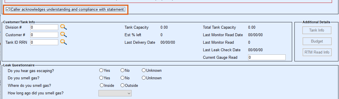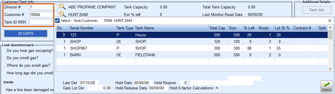 - If not pre-populated, enter or use the look up function to enter the Division #, Customer #, and Tank ID RRN.