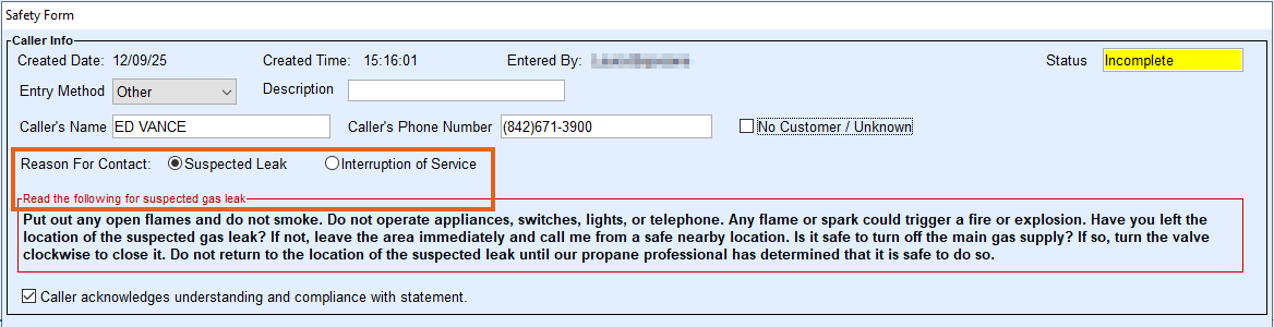 - Select the appropriate Reason for Contact. This will display the correct acknowledgement statement.