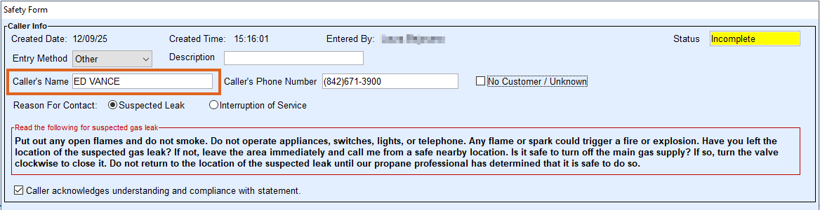 - Enter the Caller’s Name. This may be different than the name on the customer record. This field will hold 256 alpha characters and is a required field.