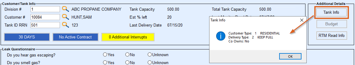 - Select the Tank Info button to view the Customer Type, Delivery Type and Co Owns information for that tank.