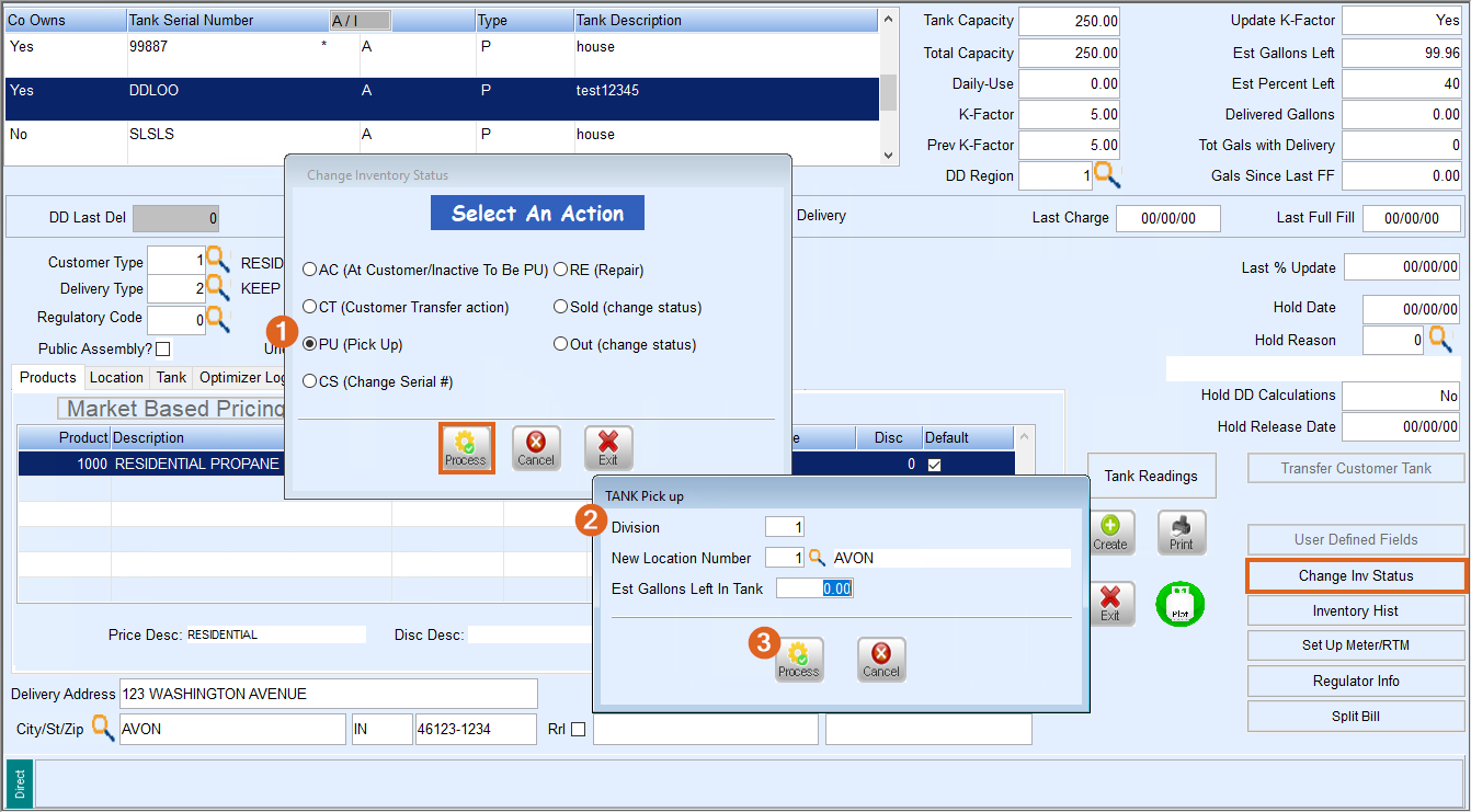 - Select Process. This will inactivate the current tank and place it back into inventory.