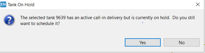 Note: Tanks on Hold with an active call in can be scheduled on the Energy Map with a a message that alerts the tank is on hold.
