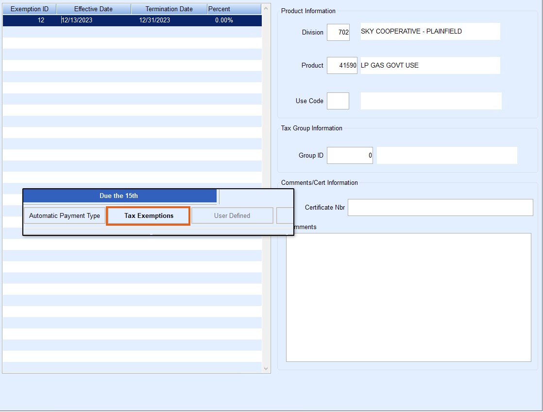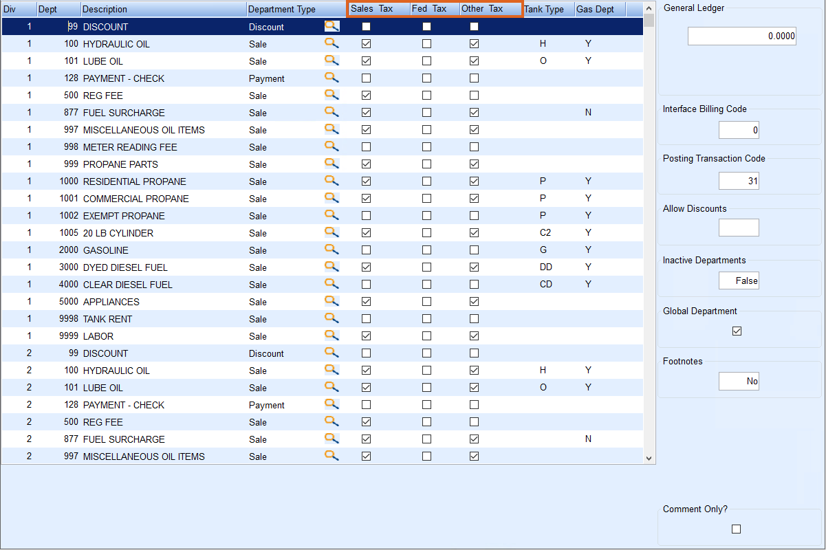 At the department (Product) level, define if a specific department is exempt from sales tax or fuel tax. In that case, the system will not apply taxes defined as sales or fuel tax at the group level.