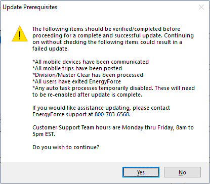 - Upon selecting Install, the Update Prerequisites window will display. Review the information provided and select Yes to continue.