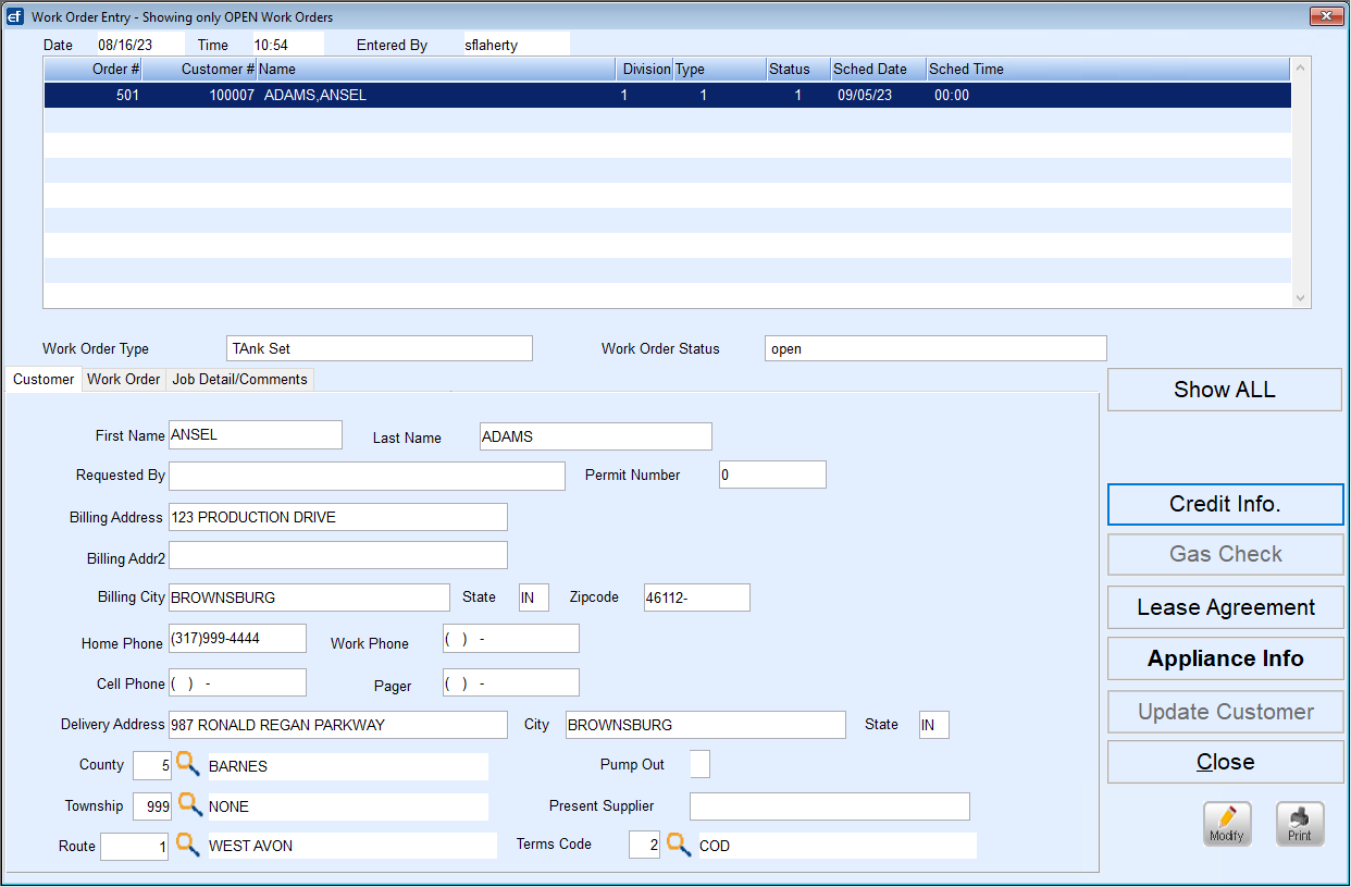 Work Order screens are accessible by pressing Ctrl+S within any menu of Energy Force or select the Work Order button from within the customer’s account. If a Work Order already exists for the customer, the Work Order button will appear in bold.