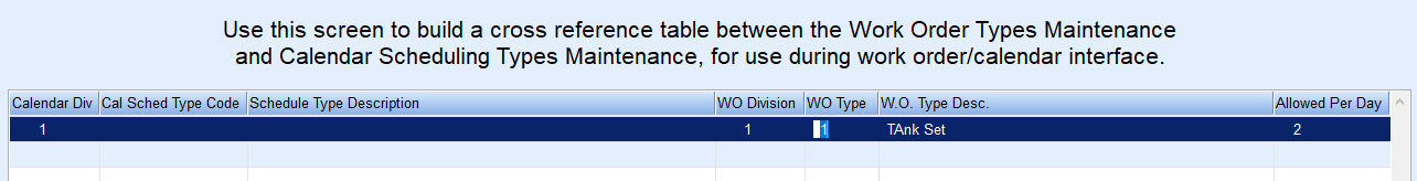 The following cross reference table must be built to utilize Work Orders and Calendar Scheduling.