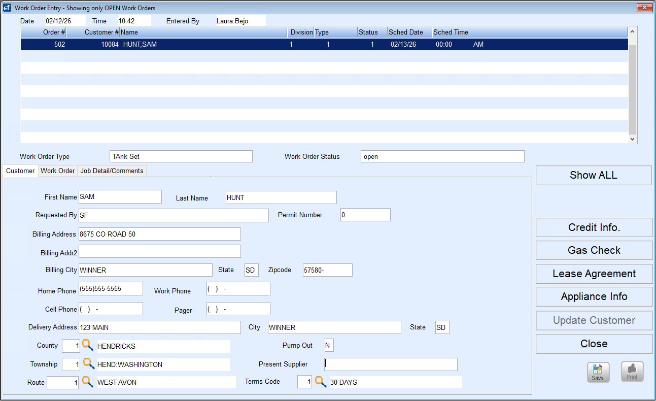 - The Billing Address, Phone Numbers, Delivery Address, County, Township, and Route fields will update automatically. Press Tab through these fields.