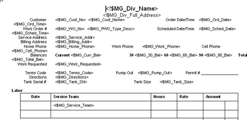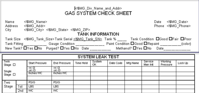 Energy Force will download the essential information (Name, Address, City, State, Zip, Date, Phone, Tank Size, Tank Serial) to the printable Work Order or Gas System check template. The template can be modified to add or remove items as long as there is no change in the programming (in brackets) names or the name of the document. Contact Energy Force Support at 800.752.7912 for more information.
